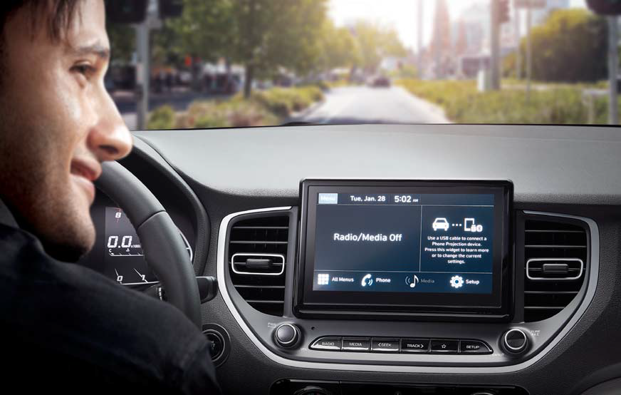 Accent’s well-appointed two-tone cabin provides the perfect space to relax and to be productive too. Once you shut the doors, the peace and quiet will amaze you because Accent is exceptionally well-insulated from road and wind noise. And to keep you well connected and productive while you’re on the road, the 8-inch multimedia display offers full support for smartphone connectivity and a lot more through a touchscreen display with easy-to-navigate menus. The colorful dials on the instrument are razor-sharp, precise and easy to read thanks to digital display technology.